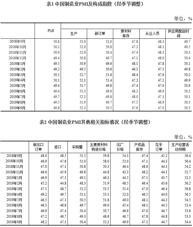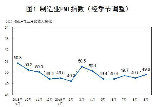 9月30日国家统计局消息,2019年9月30日国家统计局服务业调查中心和中国物流与采购联合会发布了中国采购经理指数。2019年9月份,中国制造业采购经理指数(PMI)为49.8%,比上月回升0.3个百分点。2019年9月份,非制造业商务活动指数为53.7%,略低于上月0.1个百分点,非制造业总体延续平稳扩张态势。