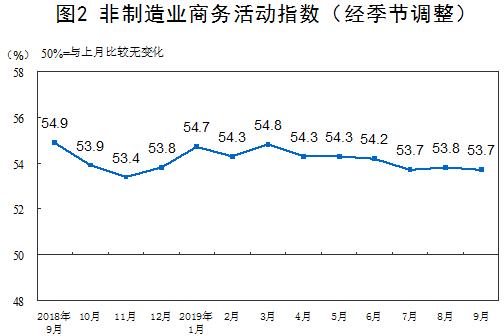 2019年9月份,非制造业商务活动指数为53.7%,略低于上月0.1个百分点,非制造业总体延续平稳扩张态势。