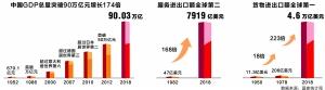 2010年中国GDP突破40万亿元,超过日本稳居世界第二位,仅次于美国。近3年中国经济总量连续跨越了70万亿元、80万亿元和90万亿元的大关,占世界经济比重接近16%,而在新中国成立初期,这一比例尚不足5%。