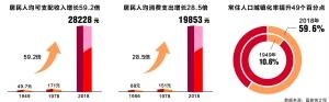 伴随着中国经济腾飞,城乡居民收入大幅提升,居民财富不断增长。1949年中国居民人均可支配收入仅为49.7元,2018年居民人均可支配收入达到28228元,扣除物价因素实际增长59.2倍,年均实际增长6.1%。2018年居民人均消费支出达到19853元,扣除物价因素实际增长28.5倍,年均实际增长5.6%。