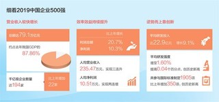 效率效益持续提升。2019中国企业500强利润总额、净利润分别比上年500强增长20.7%、10.3%,其中制造业企业500强净利润增长19.44%,增速提高0.26个百分点,连续三年保持在19%以上。500强的净资产利润率为9.7%,比上年提升了0.2个百分点;人均营业收入235.47万元,比上年500强增加12.47万元,实现三连升;人均净利润10.51万元,比上年500强提高0.47万元,实现两连增。