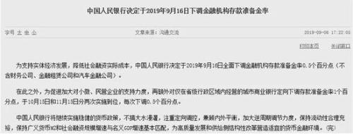 根据央行此前公告,为促进加大对小微、民营企业的支持力度,额外对仅在省级行政区域内经营的城市商业银行定向下调存款准备金率1个百分点,于10月15日和11月15日分两次实施到位,每次下调0.5个百分点。