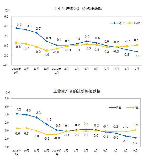 2019年9月份,全国工业生产者出厂价格同比下降1.2%,环比上涨0.1%;工业生产者购进价格同比下降1.7%,环比上涨0.2%。1—9月平均,工业生产者出厂价格与去年同期持平,工业生产者购进价格下降0.3%。