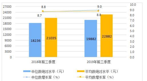 前三季度,全国居民人均可支配收入中位数19882元,增长9.0%,中位数是平均数的86.9%。其中,城镇居民人均可支配收入中位数29304元,增长7.6%,是平均数的91.8%;农村居民人均可支配收入中位数10172元,增长10.0%,是平均数的87.5%。