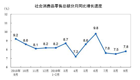 9月份,社会消费品零售总额34495亿元,同比增长7.8%。其中,除汽车以外的消费品零售额31097亿元,增长9.0%。
