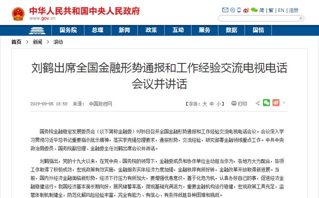 9月5日,国务院金融稳定发展委员会(以下简称金融委)召开全国金融形势通报和工作经验交流电视电话会议。会上,中共中央政治局委员、国务院副总理、金融委主任刘鹤指出,当前,国内外经济金融面临新形势,经济下行压力有所加大,要增强忧患意识,善于化危为机,认真办好自己的事,促进经济金融稳健运行。我国经济基本面长期向好,居民储蓄率高,微观基础充满活力,重要金融机构运行稳健,宏观政策工具充足,监管体制机制健全,防范化解风险经验丰富,完全有能力、有信心、有条件战胜各种困难和挑战。