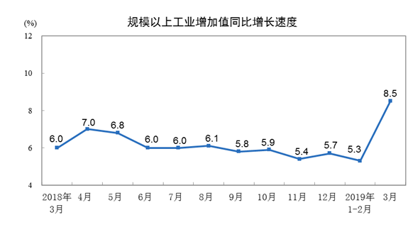 2019年3月份,规模以上工业增加值同比实际增长8.5%(以下增加值增速均为扣除价格因素的实际增长率),比1-2月份加快3.2个百分点。从环比看,3月份,规模以上工业增加值比上月增长1%。一季度,规模以上工业增加值同比增长6.5%。