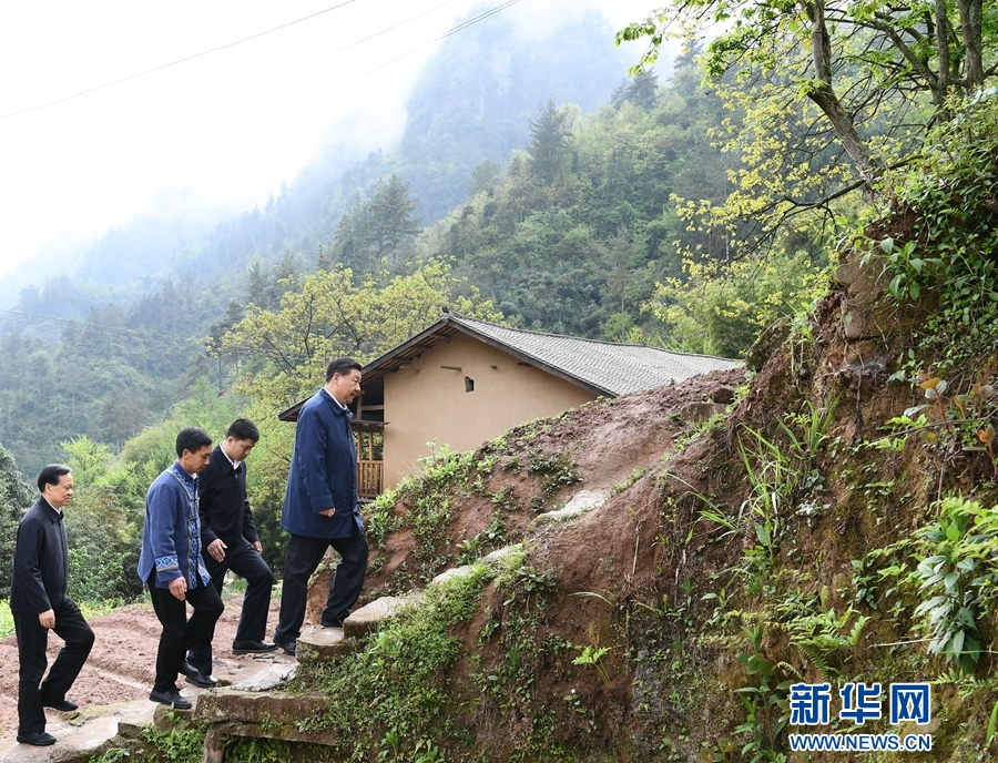 这是4月15日下午,在石柱土家族自治县中益乡华溪村,习近平踏着湿滑的石阶登上陡坡,前往贫困户谭登周家看望。 新华社记者 谢环驰 摄