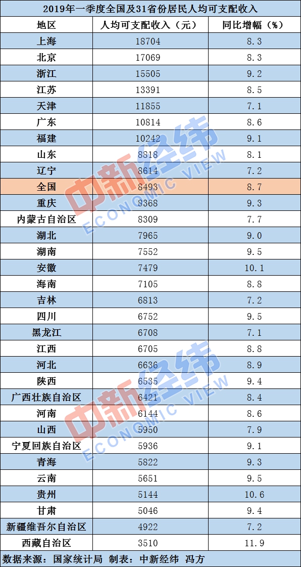 近日,国家统计局陆续公布2019年一季度全国及各省居民人均可支配收入数据。数据显示,一季度全国居民人均可支配收入为8493元,比上年同期名义增长8.7%,扣除价格因素后实际增长6.8%。