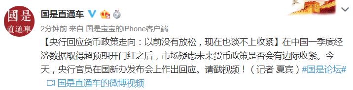 在中国一季度经济数据取得超预期开门红之后,市场疑虑未来货币政策是否会有边际收紧。今天,央行官员在国新办发布会上作出回应:以前没有放松,现在也谈不上收紧。