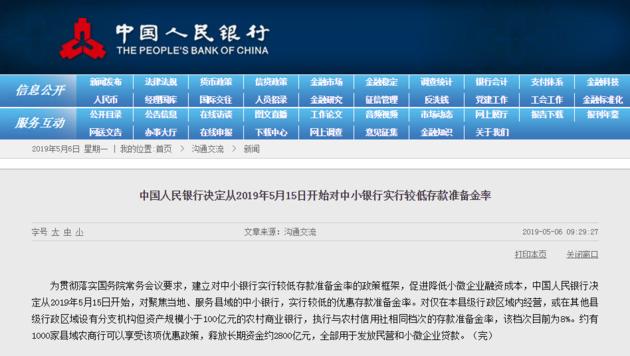 5月6日,央行官网发布消息,为贯彻落实国务院常务会议要求,建立对中小银行实行较低存款准备金率的政策框架,促进降低小微企业融资成本,中国人民银行决定从2019年5月15日开始,对聚焦当地、服务县域的中小银行,实行较低的优惠存款准备金率。对仅在本县级行政区域内经营,或在其他县级行政区域设有分支机构但资产规模小于100亿元的农村商业银行,执行与农村信用社相同档次的存款准备金率,该档次目前为8%。约有1000家县域农商行可以享受该项优惠政策,释放长期资金约2800亿元,全部用于发放民营和小微企业贷款。