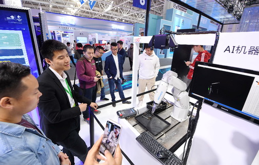 5月8日,参观者在数字中国建设成果展览会上参观AI机器视觉演示。