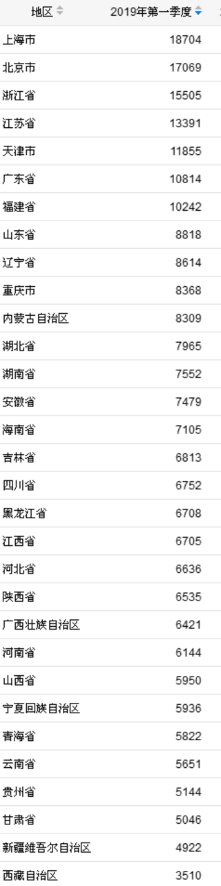 数据显示,一季度共有7个省份居民人均可支配收入突破1万元大关,包括上海、北京、浙江、江苏、天津、广东、福建。