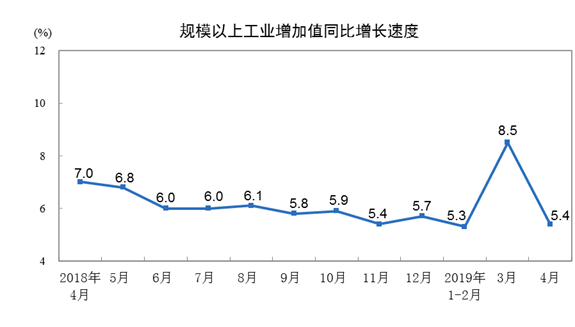 2019年4月份,规模以上工业增加值同比实际增长5.4 %(以下增加值增速均为扣除价格因素的实际增长率),比3月份回落3.1个百分点。从环比看,4月份,规模以上工业增加值比上月增长0.37%。1-4月份,规模以上工业增加值同比增长6.2%。