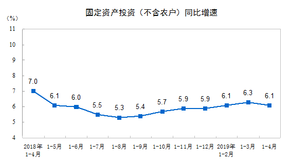 2019年1-4月份,全国固定资产投资(不含农户)155747亿元,同比增长6.1%,增速比1-3月份回落0.2个百分点。从环比速度看,4月份固定资产投资(不含农户)增长0.45%。其中,民间固定资产投资93103亿元,同比增长5.5%,增速比1-3月份回落0.9个百分点。