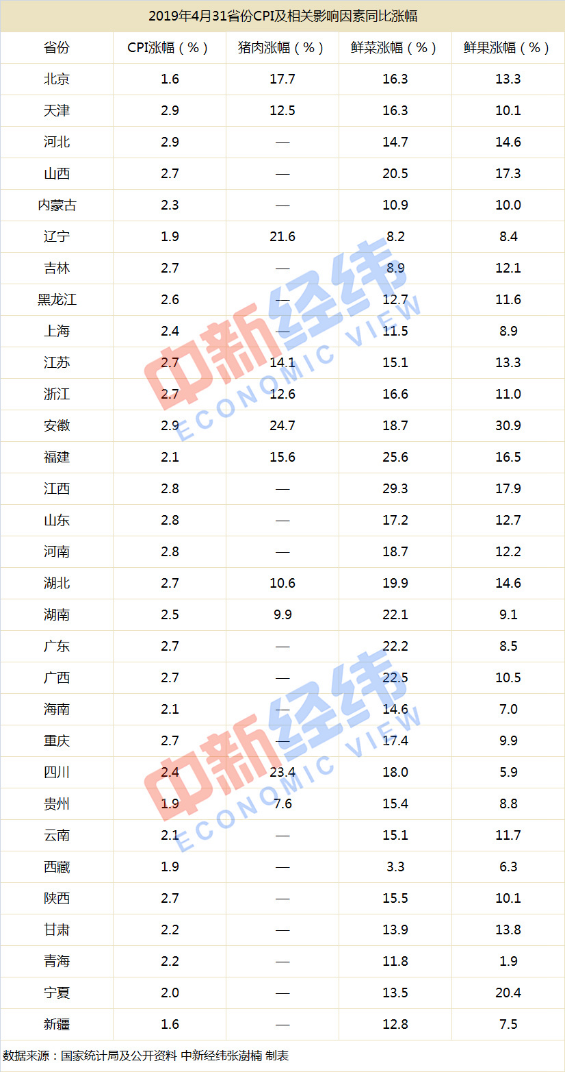 中新经纬客户端5月23日电 全国31省份2019年4月CPI数据相继出炉,“蒜你狠”“车厘子自由”“香椿自由”等热议话题近期也重回大众视野,在菜价、水果价的强势围攻下,各省CPI又有何表现?