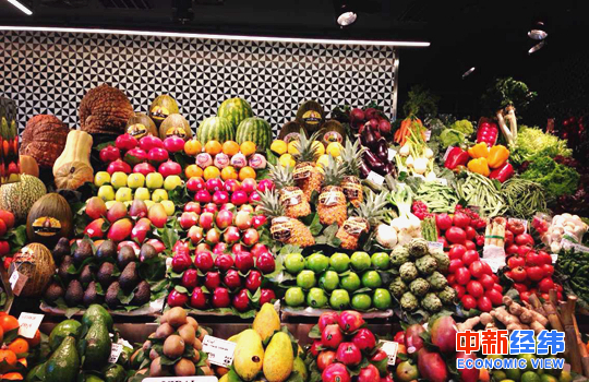 资料图:超市货架上摆放的水果。中新经纬 张澍楠摄