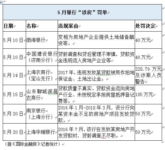 而据《国际金融报》记者梳理,5月以来(截至5月27日),各地银保监局开具的71张罚单中,共有8张罚单的案由与“信贷资金违规流向楼市”相关,累计罚款金额408.79万元;银保监分局开具的66张罚单中,虽仅1张罚单明确点出“贷款资金流向房地产”,但罚款金额却高达185万元。