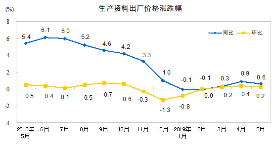 2019年5月份,全国工业生产者出厂价格同比上涨0.6%,环比上涨0.2%;工业生产者购进价格同比上涨0.2%,环比持平。1—5月平均,工业生产者出厂价格比去年同期上涨0.4%,工业生产者购进价格上涨0.2%。