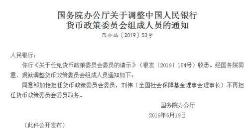 国务院办公厅发布关于调整中国人民银行货币政策委员会组成人员的通知,同意邹加怡担任货币政策委员会委员,刘伟(全国社会保障基金理事会理事长)不再担任货币政策委员会委员职务。