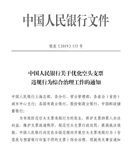 中国人民银行近日下发通知,在全国范围内开展空头支票违规行为综合治理,包括签发与预留银行印鉴不符的支票。 《中国人民银行关于优化空头支票违规行为综合治理工作的通知》,自2019年8月1日起执行。