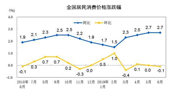 2019年6月份,全国居民消费价格同比上涨2.7%。其中,城市和农村均上涨2.7%;食品价格上涨8.3%,非食品价格上涨1.4%;消费品价格上涨3.2%,服务价格上涨1.8%。上半年,全国居民消费价格比去年同期上涨2.2%。
