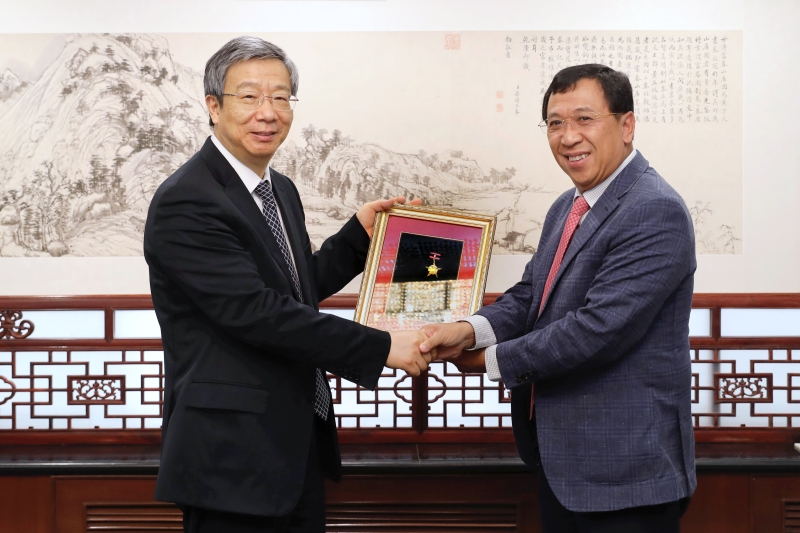 8月12日,中国人民银行行长易纲会见老挝人民民主共和国银行(下称“老挝央行”)行长宋赛·西帕赛,双方就中老双边金融合作等议题进行了交流。会见期间,宋赛·西帕赛行长代表老挝政府向人民银行颁发了友谊勋章,以表达对人民银行推动中老两国金融合作的感谢,这是老挝央行首次向中国机构颁发此类奖章。易纲行长表示,很荣幸能代表人民银行接受这枚沉甸甸的奖章,这是中老友谊常青的象征,意义不同寻常。