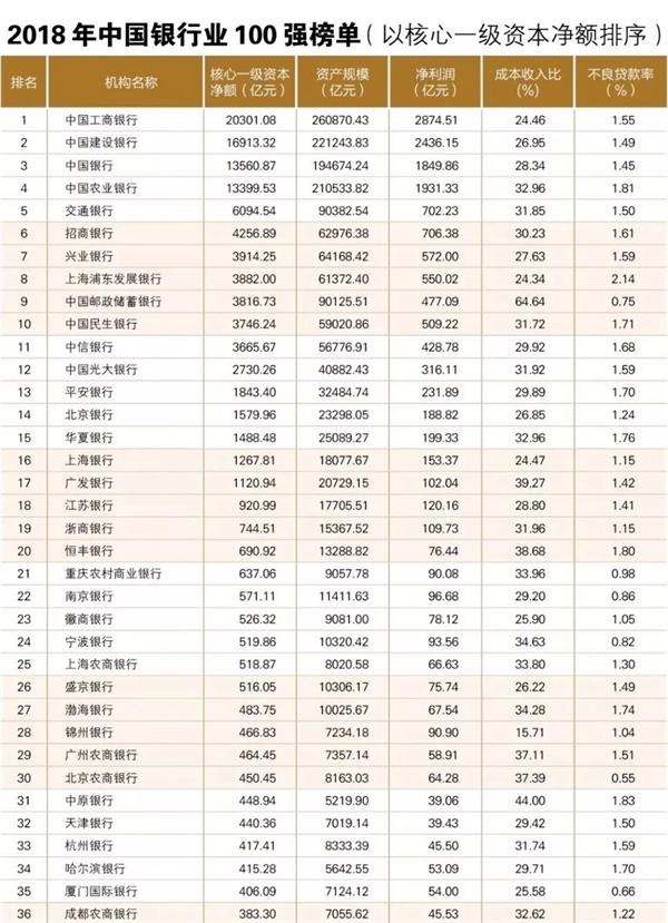 以下是中国银行业协会发布的“2018中国银行业100强榜单”(根据核心一级资本净额排序)。数据为截至2017年12月31日的合并报表数据。