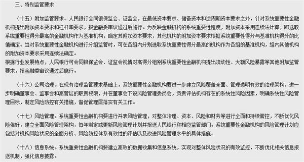 此前,人民银行有关负责人指出,《意见》仅属于一个宏观政策框架,更多的监管要求和操作细节将在未来的实施细则中加以明确。人民银行将会同相关部门,抓紧启动实施细则的制定工作,逐步出台银行业、证券业、保险业系统重要性金融机构的评估方法和附加监管要求。