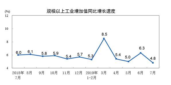 据国家统计局8月14日消息,2019年7月份,规模以上工业增加值同比实际增长4.8%(以下增加值增速均为扣除价格因素的实际增长率),比6月份回落1.5个百分点。从环比看,7月份,规模以上工业增加值比上月增长0.19%。1-7月份,规模以上工业增加值同比增长5.8%。