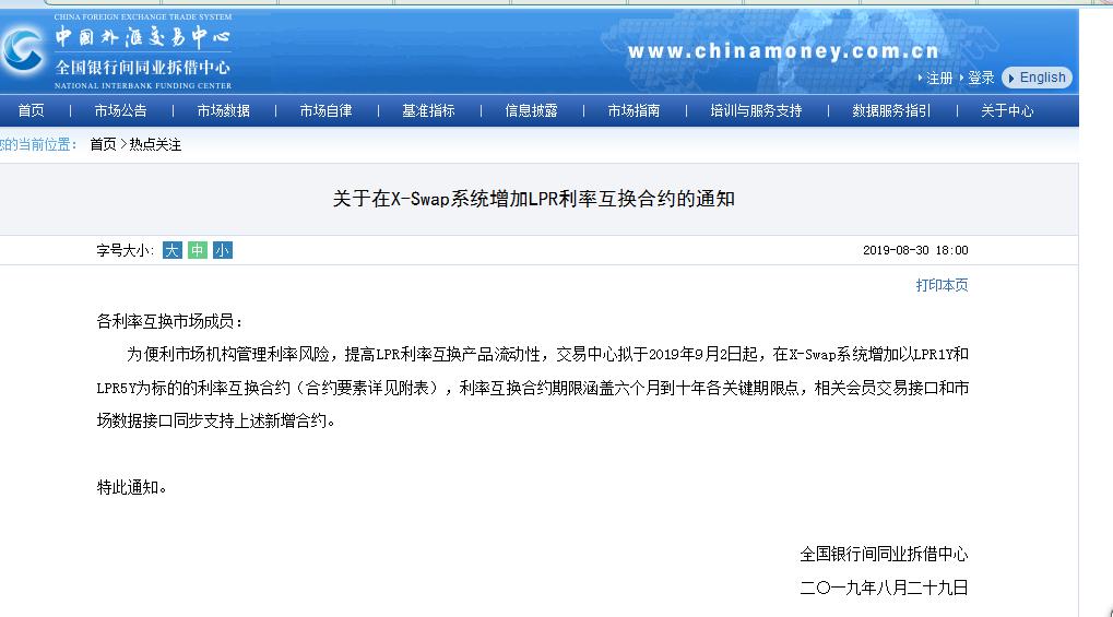 外汇交易中心称,为便利市场机构管理利率风险,提高LPR利率互换产品流动性,交易中心拟于2019年9月2日起,在X-Swap系统增加以LPR1Y和LPR5Y为标的的利率互换合约。