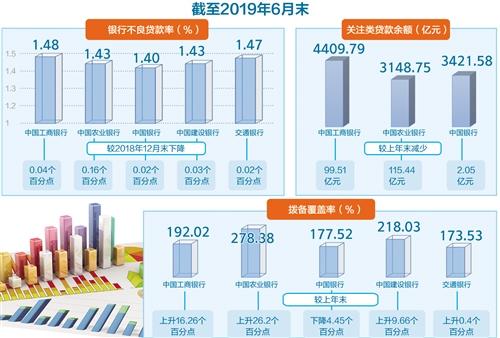 具体来看,截至今年6月末,中国工商银行、中国农业银行、中国银行、中国建设银行、交通银行的不良贷款率分别为1.48%、1.43%、1.40%、1.43%、1.47%,分别较2018年12月末下降0.04个百分点、0.16个百分点、0.02个百分点、0.03个百分点、0.02个百分点。