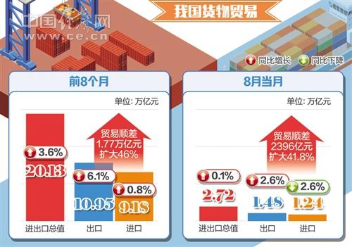 前8个月,中美贸易总值为2.42万亿元,同比下降9%,占我外贸总值的12%。其中,我对美国出口1.88万亿元,下降3.7%;自美国进口5450.1亿元,下降23.5%;对美贸易顺差1.33万亿元,扩大7.7%。