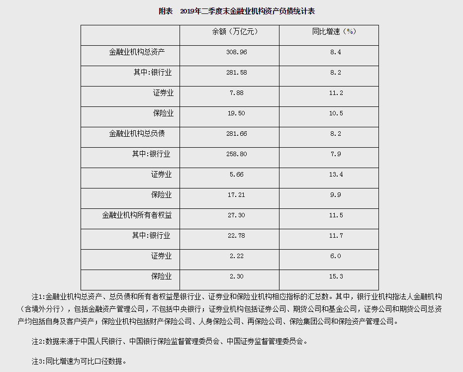 上证报中国证券网讯 据人民银行9月12日消息,初步统计,2019年二季度末,我国金融业机构总资产为308.96万亿元,同比增长8.4%,其中,银行业机构总资产为281.58万亿元,同比增长8.2%;证券业机构总资产为7.88万亿元,同比增长11.2%;保险业机构总资产为19.5万亿元,同比增长10.5%。