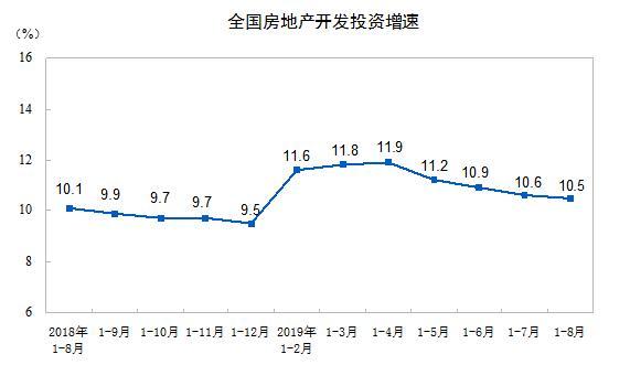 2019年1—8月份,全国房地产开发投资84589亿元,同比增长10.5%,增速比1—7月份回落0.1个百分点。其中,住宅投资62187亿元,增长14.9%,增速回落0.2个百分点。