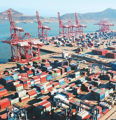 1月12日,江苏连云港港口集装箱码头一片繁忙景象。耿玉和摄(人民视觉)