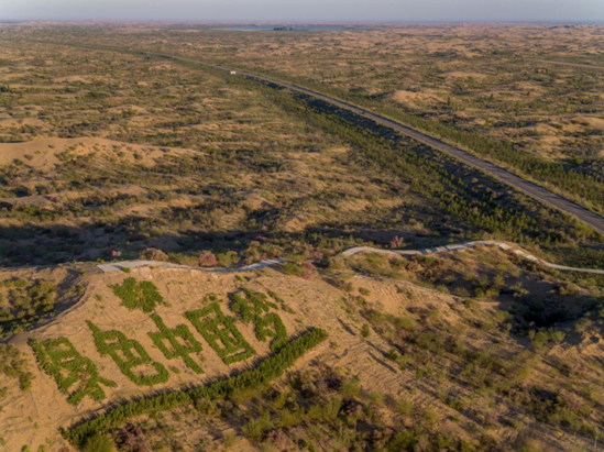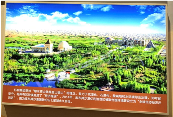 中国的民营企业,正在党和政府的领导下,为实现中国梦不懈努力。在“历史巨变”主题展厅,《中国经济闪耀东方》主题片中有一幅醒目的照片,在一座高高的沙丘上,亿利库布其治沙团队把5600株沙地柏种成“绿色中国梦”5个大字,表达了中国民营企业实现中国梦的信念、决心与信心。亿利30年治理的库布其沙漠变为绿水青山和金山银山的生态成果也在绿色发展展区突出展示。