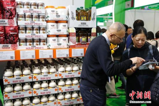 资料图:首届中国国际进口博览会食品及农产品展区,参观者与商家交流商品信息。中新社记者 殷立勤 摄