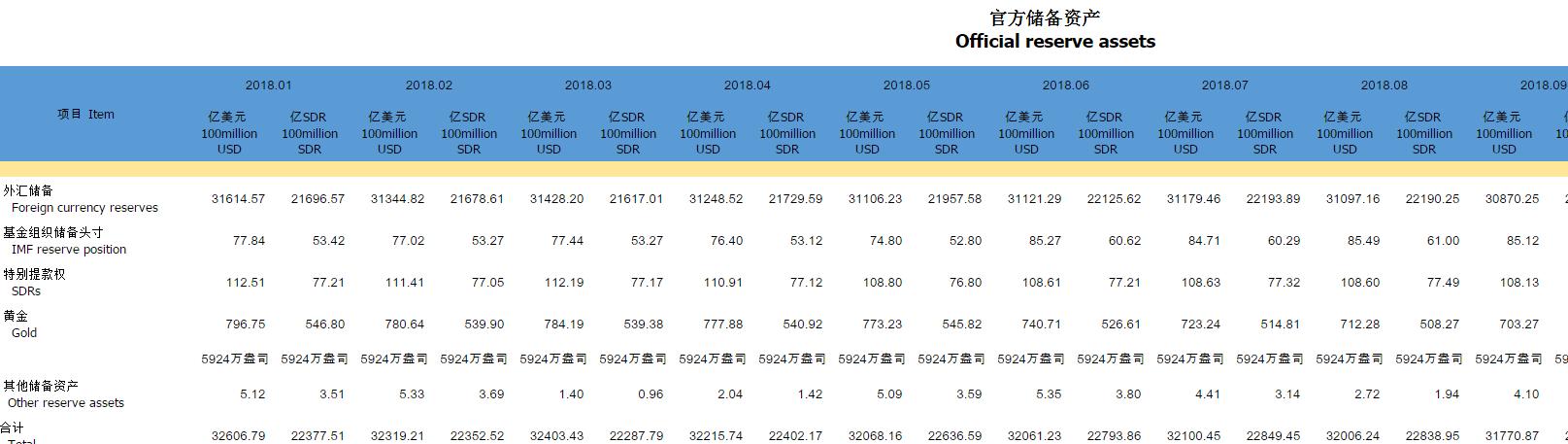 中国9月外汇储备30870.2亿美元,预期31050亿美元,前值31097.2亿美元。中国9月末黄金储备5,924万盎司,8月末为5,924万盎司。中国9月末黄金储备703亿美元,8月末为712亿美元。