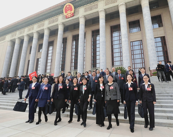 中国工会第十七次全国代表大会10月22日上午在北京人民大会堂开幕。图为金融代表团成员走出人民大会堂。 本报记者 燕平 摄