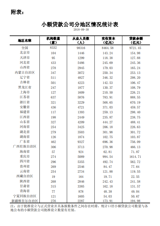 截至2018年9月末,全国共有小额贷款公司8332家,贷款余额9721亿元,前三季度减少19亿元。