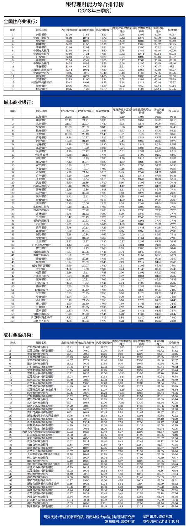 中信银行、招商银行、华夏银行居全国性银行前三;徽商银行、上海银行、江苏银行居城市商业银行前三;广州农商银行居农村金融机构榜首