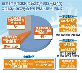 近期,各省区市陆续公布2018年前三季度经济运行“成绩单”。截至10月29日,已有25个省区市公布了主要经济指标运行数据。其中,云南、贵州、江西等15个省区市经济增速快于全国6.7%的GDP增速;北京、江苏的增速与全国持平;其余省区市的增速慢于全国增速。