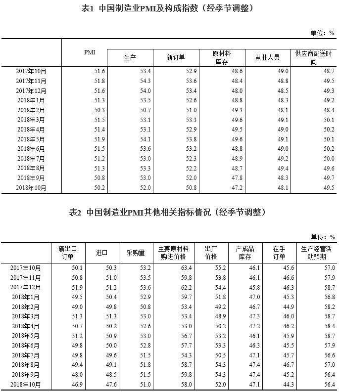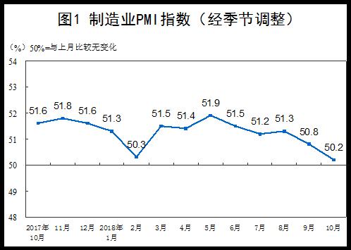 2018年10月份,中国制造业采购经理指数(PMI)为50.2%,比上月回落0.6个百分点,制造业总体继续运行在扩张区间,但扩张速度放缓。