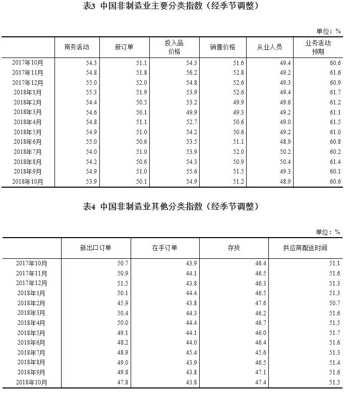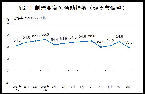 2018年10月份,中国非制造业商务活动指数为53.9%,比上月回落1.0个百分点,表明非制造业继续保持增长态势,增速有所放缓。
