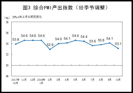2018年10月份,综合PMI产出指数为53.1%,比上月回落1.0个百分点,表明我国企业生产经营活动延续扩张态势,但增速有所放缓。