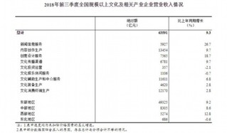 据对全国规模以上文化及相关产业6.0万家企业调查,2018年前三季度,上述企业实现营业收入63591亿元,比上年同期增长9.3%[1](按可比口径计算,考虑统计制度规定的口径调整、统计执法增强等因素影响,详见附注6),继续保持较快增长。