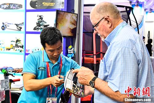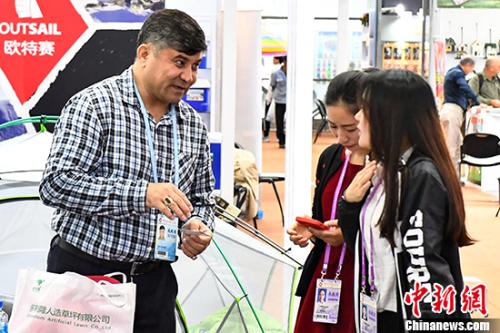 11月4日,体育用品参展商向采购商介绍产品情况。中新社记者 陈骥旻 摄