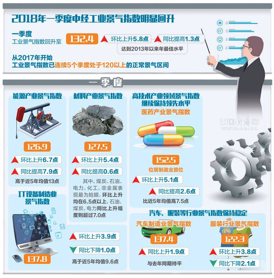 在去年景气指数连续3个季度温和下降之后,2018年一季度中经工业景气指数明显回升。一季度工业景气指数回升至132.4,环比上升5.8点,同比提高1.3点,达到2013年以来年最佳水平。从2017年开始,工业景气指数已连续5个季度处于120以上的正常景气区间。