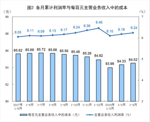 1-4月份,规模以上工业企业实现主营业务收入34.1万亿元,同比增长10.5%;发生主营业务成本28.8万亿元,增长10.2%;主营业务收入利润率为6.24%,同比提高0.24个百分点。